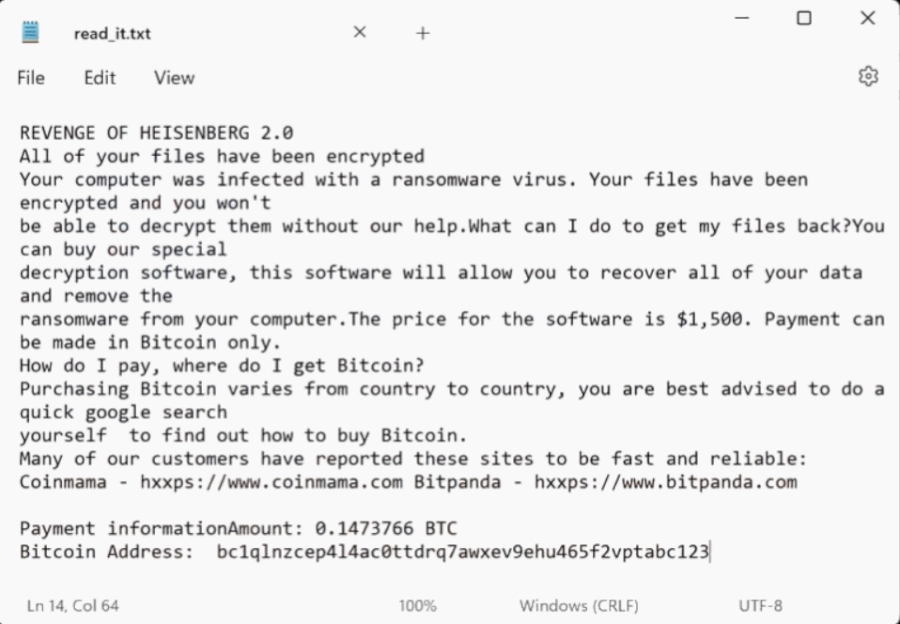 Revenge Of Heisenberg Ransomware is a deceptive and malicious program designed to encrypt files on an infected computer and subsequently demand a ransom for their decryption. This ransomware has been discovered as one of the numerous threats based on the Chaos ransomware builder. Upon infection, it immediately encrypts the user’s files and appends each with an extension of four random characters — examples include file names changing from 1.jpg to something like 1.jpg.nw2n. These alterations make the files inaccessible without obtaining the decryption key. The malware alters the desktop wallpaper and deposits a ransom note, typically titled read_it.txt, on the desktop to inform victims about the encryption and provide instructions on how to recover their data. This note explains that the decryption tools must be purchased from the attackers, usually for a specified sum in Bitcoin cryptocurrency; however, due to the volatile nature of Bitcoin exchange rates, the exact cost may fluctuate significantly.
