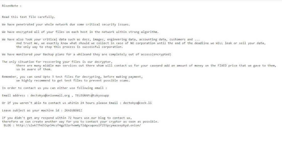 Risen Ransomware represents a new and sophisticated threat in the realm of cybercrime. This malware encrypts user files utilizing robust encryption algorithms, making data recovery without the decryption key nearly impossible. Typically, it targets a variety of file types, including but not limited to documents, images, and databases. Files affected by Risen Ransomware receive malicious extensions that follow a specific format, such as .[ransom_email, TELEGRAM:ID].random_ID, which serves as a distinct indicator of the attack and the ransom demand that follows. The primary ransom note, titled $Risen_Guide.hta, takes the form of a pop-up and contains clear instructions for victims, providing an email address and a Telegram handle through which they can initiate negotiations for the return of their files. Additionally, $Risen_Note.txt file is created containing the ransom note. Alongside this, the Risen.exe file is executed on compromised systems to carry out the encryption process.