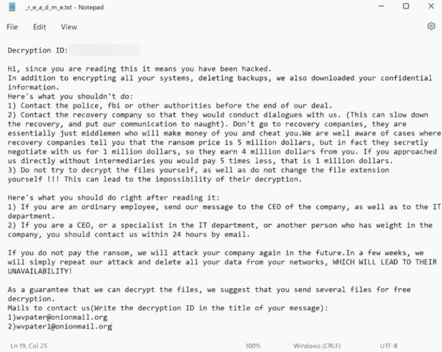 Rorschach Ransomware, also known as BabLock, is a sophisticated strain of ransomware that specifically targets small and medium-sized businesses, as well as industrial companies. Upon infection, it encrypts various file types and appends a unique identifier to the filenames, which is a random string of characters followed by a two-digit number ranging from 00 to 98. For example, a file such as report.docx might be altered to report.docx.yhdbgt.23. This nefarious ransomware employs a highly effective hybrid cryptography scheme that combines the curve25519 and eSTREAM cipher hc-128 algorithms. Such an encryption process not only makes the files inaccessible but also ensures that it is incredibly challenging for victims to recover their data without assistance. Victims receive a _r_e_a_d_m_e.txt ransom note, typically found in the same directories as the encrypted files, that outlines the situation, threatens further attack, and provides contact information for cybercriminals.