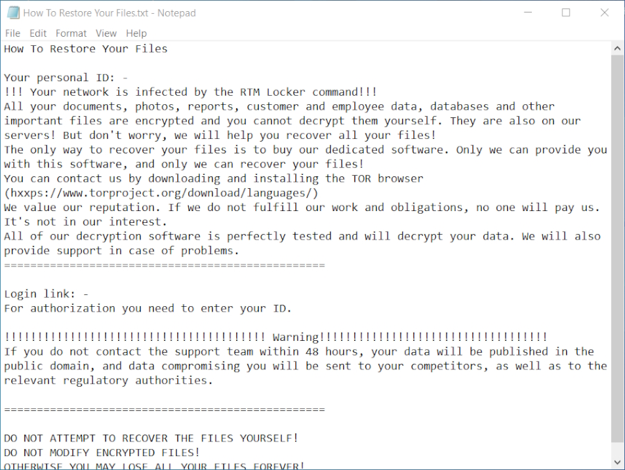 You have 48 hours to contact usAs of the current understanding, there are no publicly available decryption tools capable of decrypting files encrypted by RTM Locker without the attacker’s private key. The encryption method’s complexity, combining asymmetric and symmetric encryption, ensures that decryption without the necessary keys is not feasible. Given the lack of decryption tools, the primary method for recovering files encrypted by RTM Locker is to restore from backups. Victims are strongly advised against paying the ransom, as this does not guarantee file recovery and further incentivizes the attackers. Instead, affected individuals and organizations should focus on isolating the infected systems, identifying the ransomware variant, and engaging with cybersecurity professionals to mitigate the attack’s impact and prevent future incidents.