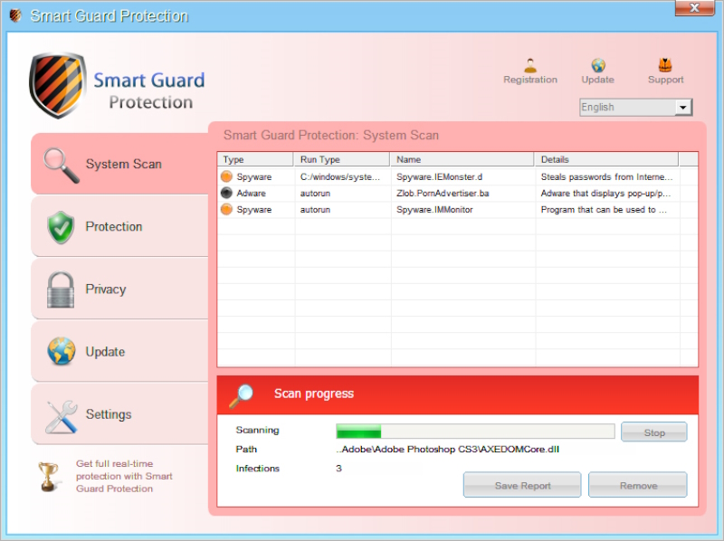 To remove Smart Guard Protection from Windows completely, we recommend you to use SpyHunter 5. It detects and removes all files, folders, and registry keys of Smart Guard Protection and several millions of other adware, hijackers, toolbars. The trial version of Spyhunter 5 offers virus scan and 1-time removal for FREE.