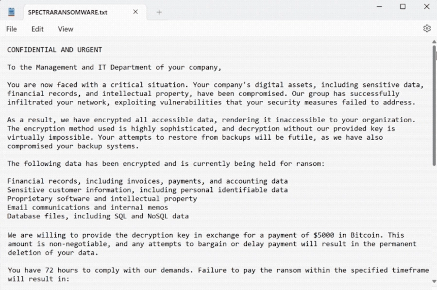 Spectra Ransomware is a malicious software variant that encrypts files on an infected system to extort money from victims. Emerging from the shadowy world of cyber threats, Spectra operates by encrypting target files and appending them with four random characters, effectively locking the original content out of reach. For instance, a file named 1.jpg might be transformed to 1.jpg.hecm or similar during an attack. This malware leverages encryption derived from the infamously tough Chaos Ransomware family, making it particularly challenging for unauthorized decryption efforts. Upon encrypting files, Spectra leaves a ransom note, humorously styled as SPECTRARANSOMWARE.txt, which is strategically scattered across various directories, often in the same locations as the encrypted files. Within this note, victims find dreaded demands for payment in Bitcoin, typically amounting to $5000, in exchange for a decryption key. The cybercriminals underline a 72-hour window for payment, threatening irreparable data damage and the disclosure of sensitive company information as deterrents against non-payment.