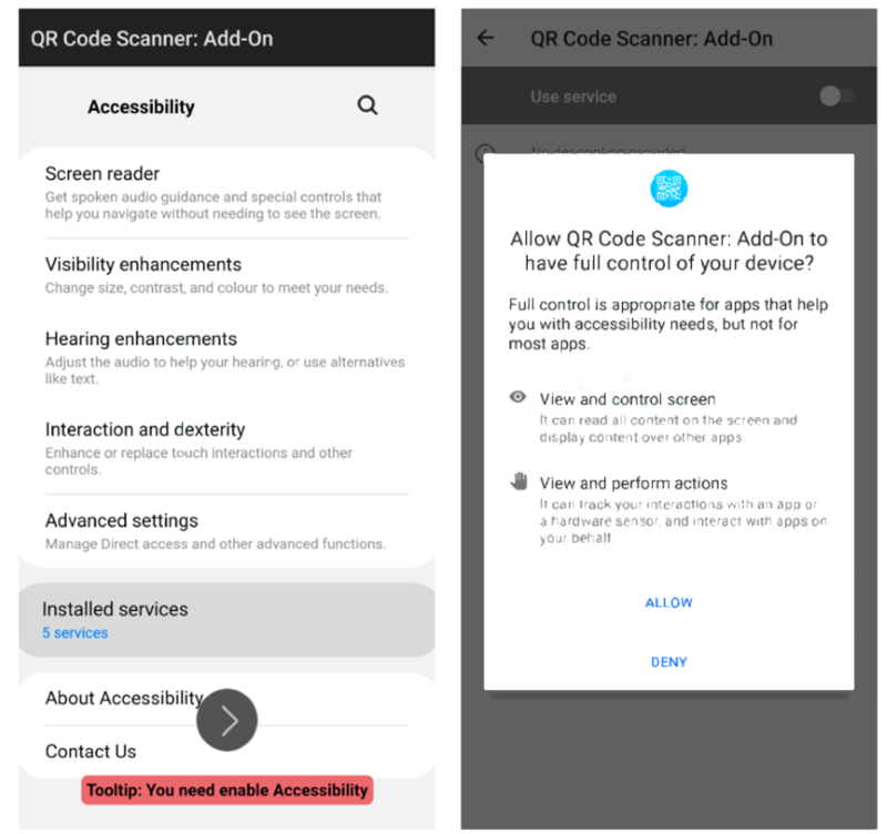 Teabot is a trojan infection that seeks extraction of banking-related data. Based on publicly-available reports, it is known that TeaBot has been targeting more than sixty banks across Europe. Upon getting installed onto a smartphone, it demands users to allow certain Accessibility Features by sending a number of pop-up windows. Once the requested permissions are given, developers behind Teabot will become able to control the infected device using Remote Access Tool (RAT). This will allow cybercriminals to deploy any malicious commands they want (e.g. replicate log-in credentials, take screenshots, manage contacts and send messages, disable security layers, record audio, etc.). As mentioned, the main target of this trojan comes down to financial information meaning cybercriminals might be more interested in stealing data from crypto wallets, banking or insurance apps, and so forth. To conclude, the presence of Teabot may and will be extremely dangerous for all kinds of sensitive data unless it is removed from your device. We recommend you do it as soon as possible using our guidelines below. Step-by-step instructions will help you delete it without traces.