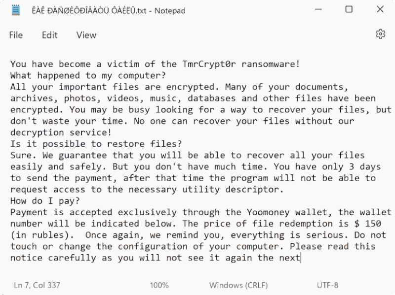 Payment is accepted exclusively through the Yoomoney wallet, the wallet number will be indicated below. The price of file redemption is $ 150 (in rubles). Once again, we remind you, everything is serious. Do not touch or change the configuration of your computer. Please read this notice carefully as you will not see it again the nextRemoving TmrCrypt0r ransomware from the operating system will prevent it from encrypting more data. However, removal will not restore already compromised files. The sole solution is to recover them from a backup (if one was created beforehand and is stored elsewhere). There are no free decryption tools available for TmrCrypt0r at the moment, but it is recommended to check the Emsisoft website for any updates on decryption tools.
