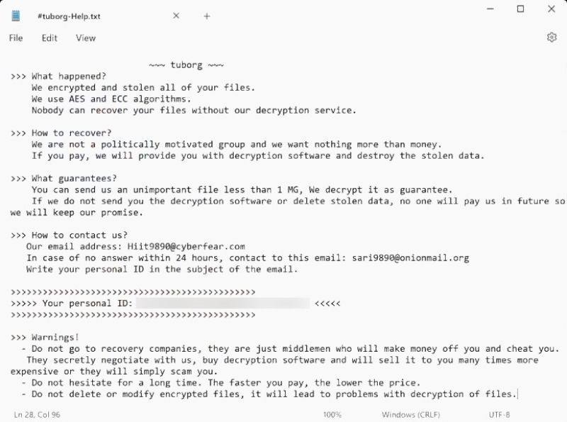 Tuborg Ransomware is a malicious software variant that encrypts files on the infected systems, rendering them inaccessible to users. It is identified as a variant of the Proton ransomware family. This ransomware specifically targets various file types and appends a unique extension, .tuborg, to the filenames after encrypting them. For example, a file originally named 1.jpg would be renamed to 1.jpg.[Hiit9890@cyberfear.com].tuborg after encryption. Upon successful infection, Tuborg Ransomware employs robust encryption algorithms, specifically AES (Advanced Encryption Standard) and ECC (Elliptic Curve Cryptography), to lock files. This encryption is highly secure, making unauthorized decryption extremely challenging without the necessary decryption keys held by the attackers. The ransomware generates a ransom note in a text file named #tuborg-Help.txt, which is placed on the desktop or in folders containing encrypted files. This note informs victims that their files have been encrypted and stolen, and recovery without the attackers’ decryption service is impossible. It demands payment in exchange for decryption software and the destruction of the stolen data. The note also typically includes contact information and warns against seeking help from third-party recovery companies, suggesting that quick action may reduce the ransom amount.