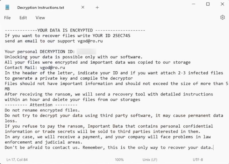 , highlighting the extent of the encryption. Ransomware like this usually employs complex encryption algorithms, often relying on advanced cryptographic techniques to ensure that decryption without the appropriate keys is virtually impossible. When victims discover their systems compromised, they encounter a ransom note named Decryption Instructions.txt, strategically placed in various folders across the infected system, including the desktop. This note informs victims of the encryption, provides a unique decryption ID, and demands that they contact the attackers via email, typically including instructions to pay a ransom in exchange for the recovery tool and key.