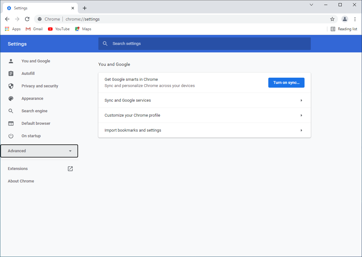 - Choose Settings and click Advanced on the left side and choose Browser.