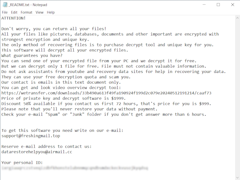 . Watz Ransomware employs a combination of AES-256 and RSA-2048 encryption algorithms. AES-256 is used to encrypt the files, while RSA-2048 is used to encrypt the AES key. This dual-layer encryption ensures that decrypting the files without the private key held by the attackers is nearly impossible. After encrypting the files, Watz Ransomware creates a ransom note named _readme.txt in each folder containing encrypted files. The ransom note typically includes instructions on how to pay the ransom, the amount demanded (usually in cryptocurrency), and contact information for the attackers. The note may also offer a “discount” if the ransom is paid within a specified timeframe.