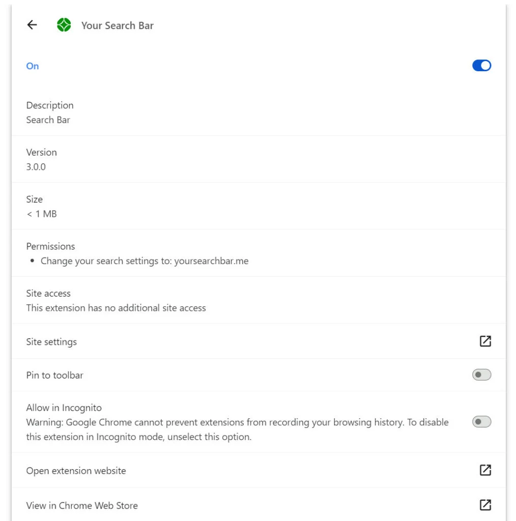 Your Search Bar is a rogue browser extension that functions as browser-hijacking software. It alters browser settings to promote the yoursearchbar.me fake search engine through redirects. This software typically modifies browsers by assigning endorsed website addresses as the default search engines, homepages, and new tab/window URLs. As a result, web searches performed via the URL bar and new browser tabs/windows opened result in redirects to the yoursearchbar.me webpage. The browsers affected by Your Search Bar include Google Chrome and Firefox, among others. The extension modifies the settings of these browsers, changing the default search engine, homepage, and new tab/window URLs. To remove Your Search Bar, you need to uninstall the unwanted applications using the Control Panel. In Google Chrome, you can disable “Your Search Bar” in the “On startup” section of the settings. If the browser hijacker URL (hxxp://www.yoursearchbar.me) is present, you can remove it by clicking on the three vertical dots icon and selecting “Remove”. To change your default search engine in Google Chrome, you can go to “Settings”, then the “Search engine” section, click “Manage search engines…”, look for “yoursearchbar.me”, and when located, click the three vertical dots near this URL and select “Delete” In Firefox, to reset your homepage, click the Firefox menu, then select “Settings”, in the opened window disable “Your Search Bar”. If you continue to have problems with browser redirects and unwanted advertisements, you may need to reset your browser settings or use specialized software to remove the browser hijacker.