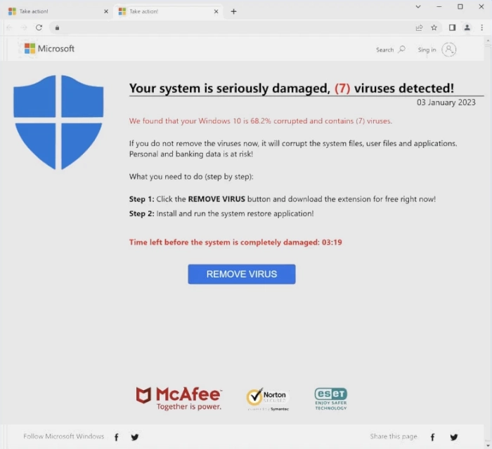 Your System Is Seriously Damaged pop-up scam is a deceitful tactic used by cybercriminals to trick users into believing that their computer is infected with multiple viruses, often claiming that sensitive personal and banking data is at risk. This scam usually appears when users visit compromised websites or click on malicious advertisements. The pop-up mimics legitimate warnings from reputable companies like Microsoft and employs scare tactics, such as countdown timers, to create a sense of urgency. By urging users to click on a “REMOVE VIRUS” button, the scam ultimately leads them to download potentially unwanted applications like OneBlock, which can serve as adware or even worse, malware. Falling for this scam can result in not only installing unwanted software but also exposing personal information to cybercriminals, leading to identity theft and financial loss. Additionally, it may pave the way for further malware infections by redirecting users to even more malicious websites. To avoid these risks, users should be cautious about clicking on unsolicited pop-ups and ensure that their browsers and security software are always up-to-date.