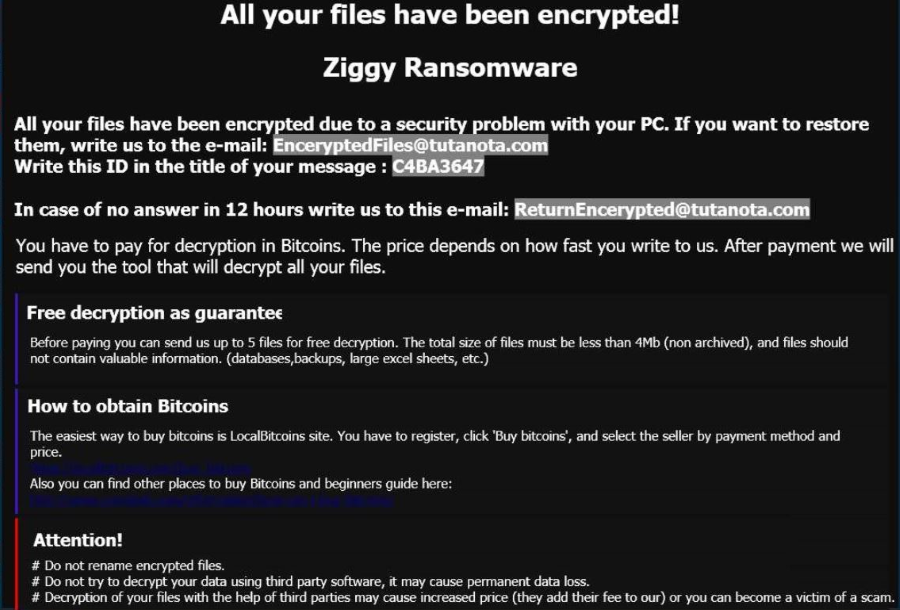 Ziggy is a new ransomware-infection recorded in December 2020. The virus sneaks into your system disabling all protectionary layers on your PC. Then, it gets the job done by running data encryption with AES256-GCM and RSA-4096 algorithms. These ensure strong encryption, which is hard to decipher. Before going deeper into details, it is important to say that there are two versions of Ziggy Ransomware. The first uses the .ziggy extension along with victims’ ID and cybercriminals’ e-mail to configure the data. The later version of Ziggy Ransomware detected recently started involving the same string of information but changed the extension at the end to .optimus. For example, a file like 1.docx would change to 1.docx.id=[88F54427].email=[khomeyni@yahooweb.co].ziggy or 1.docx.id[B68A285D].[sikbeker@tuta.io].optimus depending on which version affected your PC. Following successful encryption, the malicious program creates a text file containing decryption instructions. The name of the files can vary from version to version, so there is no commonly-used, but initially, it was called ## HOW TO DECRYPT ##.exe.