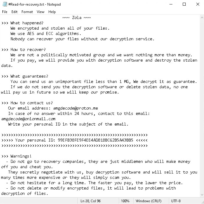 Zola Ransomware represents a significant threat within the landscape of cybercrime, emerging as a rebranded variant from the Proton family first seen in March 2023. This ransomware is engineered to encrypt a victim’s files, rendering them inaccessible until a ransom is paid. Upon infection, Zola appends the .zola extension to encrypted files, making it clear which files have been compromised. The encryption utilizes a sophisticated combination of ChaCha20 and elliptic curve cryptography for secure key exchange, ensuring that victims cannot easily recover their data without the decryption key. The ransom note, named #Read-for-recovery.txt, is generated in each affected directory, outlining the steps victims must take to recover their files, typically involving communication with the attackers via specific email addresses. This ransomware operates stealthily, employing methods to disable security measures on infected systems and often targeting multiple file types across the user’s system.