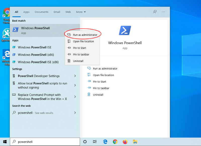 - Right-click on Powershell icon and select Run as an administrator and confirm in UAC.