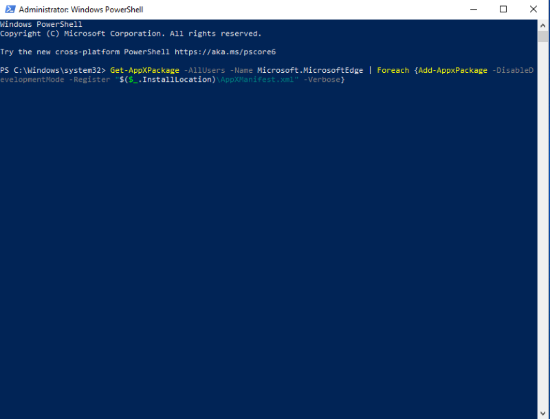 Get-AppXPackage -AllUsers -Name Microsoft.MicrosoftEdge | Foreach {Add-AppxPackage -DisableDevelopmentMode -Register "$($_.InstallLocation)\AppXManifest.xml" -Verbose}. - Click Enter