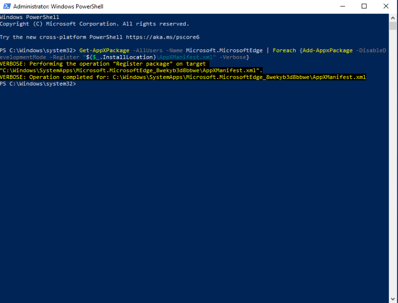 When finished you will see the message like the one shown below. Close the Powershell window and launch the Edge browser. In some cases, you need to reboot your pc to see the changes.