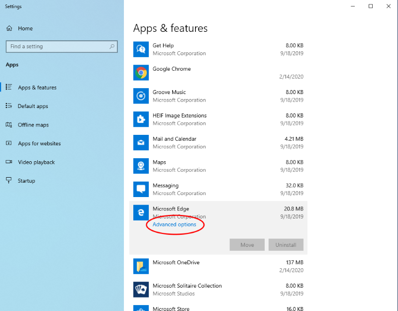 - Scroll through the list until you find Microsoft Edge, click it, and then click on the Advanced options link.