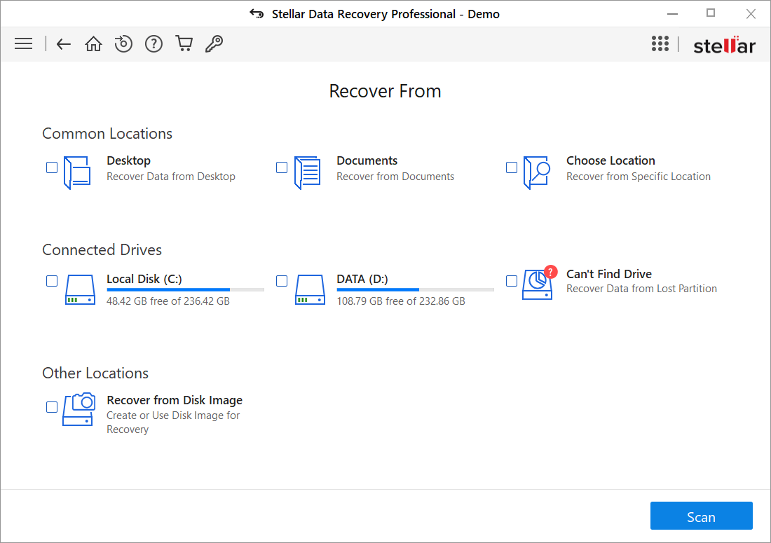 - Recover lost or deleted data. Stellar Data Recovery Professional is known to be versatile in restoring various types of files such as emails, pictures, videos, audio files, and so forth. The program deals with all types of data loss situations including drive formatting, disk corruption, file deletion, and more. It can recover data from FAT, ex-FAT, and NTFS formatted drives and partitions.