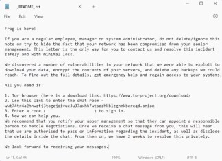 report.docx would become report.docx.frag. Once the encryption process is complete, Frag Ransomware generates a ransom note in a text file strategically named README.txt, which is typically placed within the affected directories or even on the desktop. The note ominously informs the victim that their files have been encrypted and demands a ransom in exchange for a decryption key. Unfortunately, as of the latest advisories, there are no publicly available decryption tools specifically for Frag Ransomware, making file recovery without a backup a Herculean task. How to remove ElizaRAT
