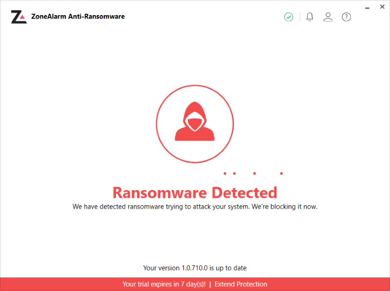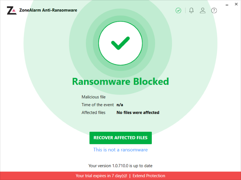 ZoneAlarm Anti-Ransomware is nothing, but a pure child of minimalism. After installing the program, you will be greeted with a single window to navigate through all of the settings you need. Unless enabled by default, users can switch on Anti-Ransomware Protection by clicking the corresponding icon on the main page. After making sure it is enabled, you will see the “You Are Protected” message on the main screen and be confident that ZoneAlarm protects you from known and unknown ransomware attacks, restores encrypted files, and operates no matter whether you have an internet connection or not. There is also the “Web Secure” option which comes as an addition to the main anti-ransomware features. Specifically, ZoneAlarm offers to install an extension that will guard your browser against phishing sites and e-mails attempting to promote malicious content. A couple of years ago, ZoneAlarm had nothing tweak. Users had to witness only the “You’re protected” title as everything was already set up by the program. Now is almost the same, though, users can bring a bit of interaction themselves. Quick support, profile, and notifications access can now be observed without leaving the program, which serves as a plus compared to older versions. Overall, ZoneAlarm Anti-Ransomware is more than easy to use. Just let it work in the background mode and have your system always protected. If there is any threat detected, you will be instantly notified about it.