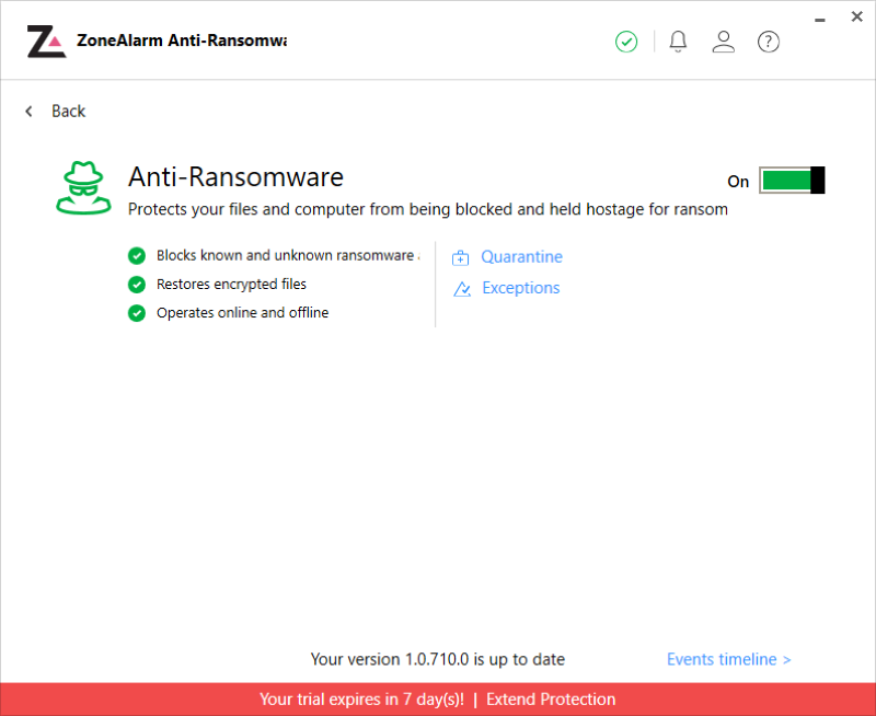 It is a very simple, yet effective standalone program designed to track all ransomware-related processes initiated on your computer and block them immediately. The program can detect potentially dangerous files and suppress their activity before they run your device into a world of trouble. With a constantly increasing number of ransomware attacks happening around the globe, users worried about their protection should by far consider installing a ransomware-protection tool, especially if they are excessively active around the web. ZoneAlarm Anti-Ransomware is focused solely on protecting your system against file-encrypting infections, so you will not be able to see any comprehensive capabilities like in ultimate anti-malware software. Ransomware protection is the only feature you should expect from this program.